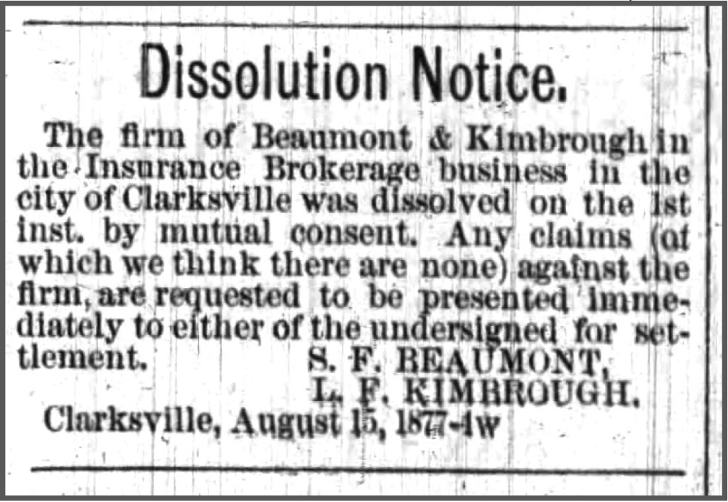 1877 proved to be a pivotal year in the life of L.F., Kate and their newborn son, Frank Richmond. In July of that year, Landen is thanked in the local paper by conventioneers who had stayed at his home. His wife isn’t mentioned, and thanks are extended to his mother and his “interesting little sisters”. Alternately, the business partnership was seemingly ill-fated as it was dissolved in August of 1877 – just three years after L.F. had married and settled in Clarksville with his wife.
