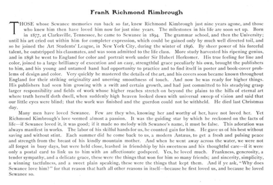 An example of his wit appears in the 1901 Cap and Gown. In a want ad format near the back of the publication appears the following: “F.R. Kimbrough announces that he will introduce a select party of eligible young men into mazes of London Society. Mr. Kimbrough’s intimacy with Burke’s Peerage renders him eminently qualified for the task”. Was this a poke at the numbers of daughters of social climbing newly rich who were being sent to England to find titled husbands? In another “ad” he described himself as “Artist and Friend to Celebrities, London, Paris and Sewanee”.