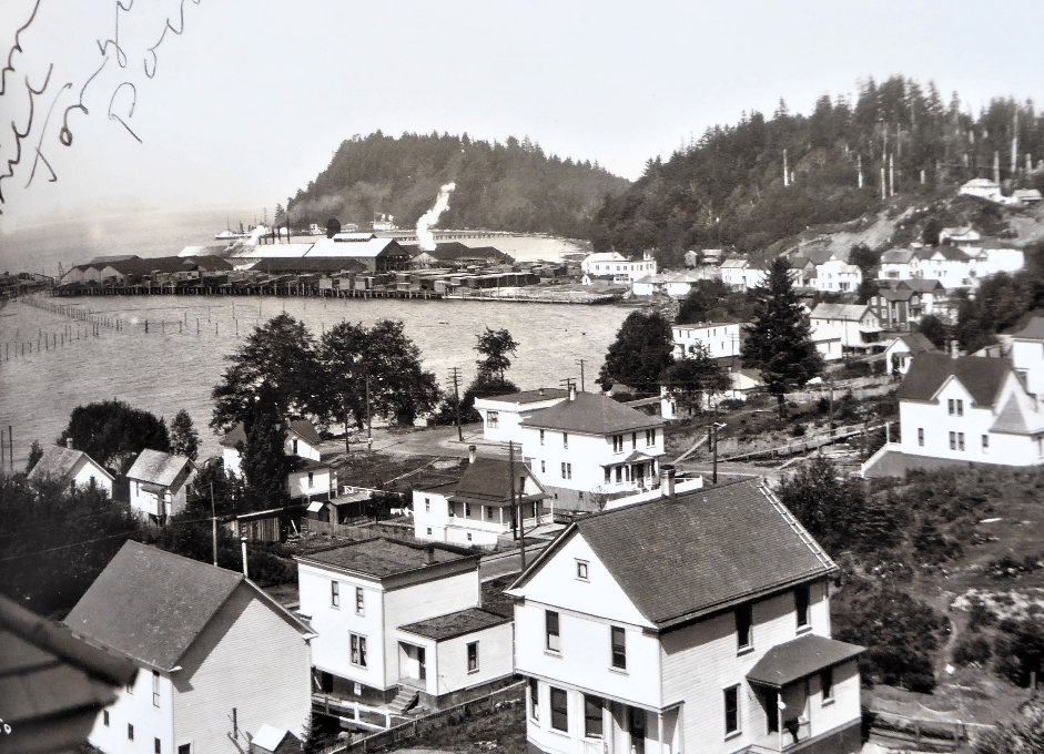 Alderbrook appears on the east side of the map; the photo shows the neighborhood and the Tongue Point Depot – see the Pearson House in the middle of the photo; the watercolor was done by George Handley, husband of one of the Anderson daughters. Thanks to Sheryl Ginnfor the photo and painting,